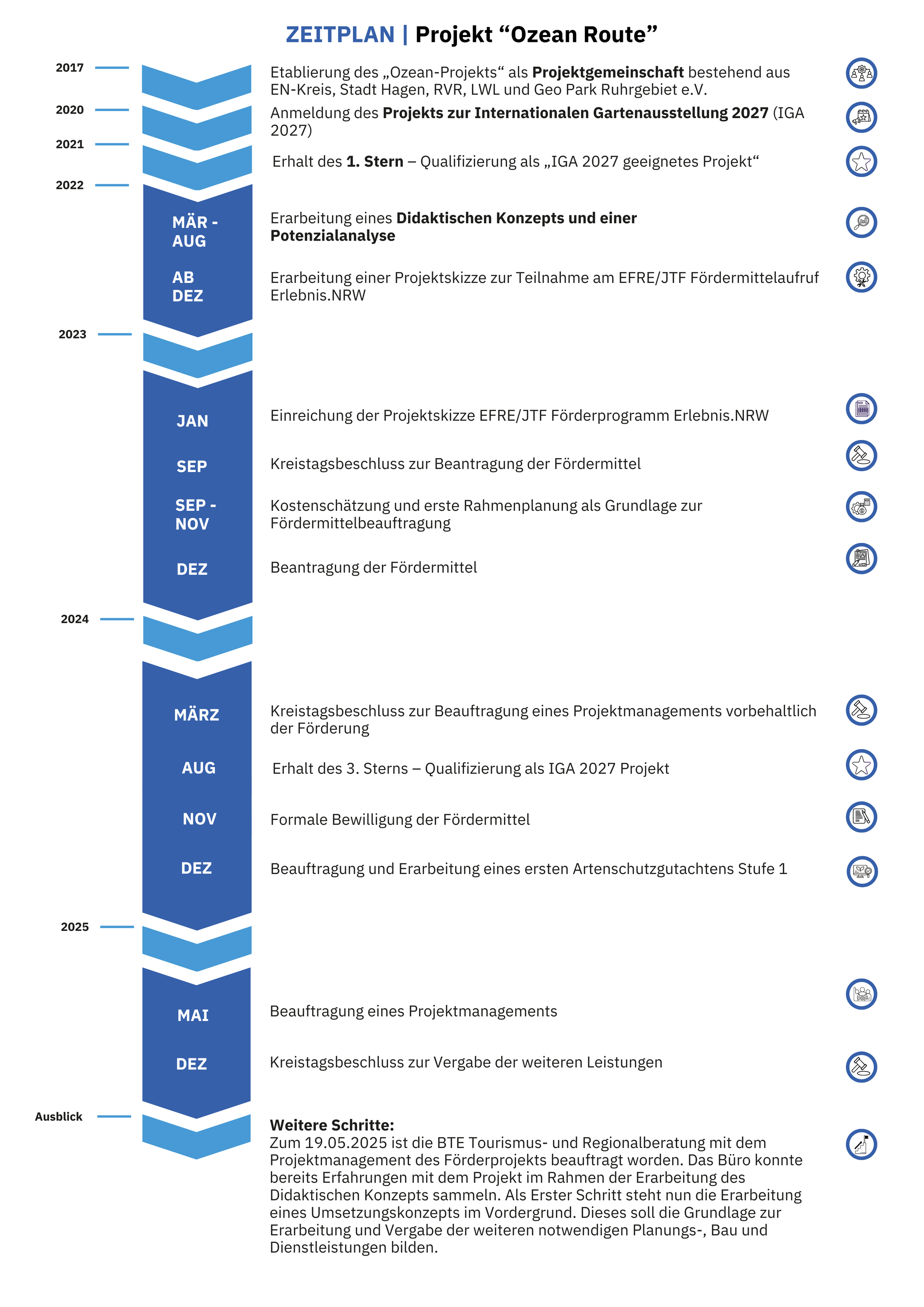 Bereits 2019 haben sich der Ennepe-Ruhr-Kreis, die Stadt Hagen, der Landschaftsverband Westfalen-Lippe (LWL) und der GeoPark Ruhrgebiet e.V. im Rahmen des „Ozean-Projekts“ auf den Weg gemacht, diese Inhalte innerhalb eines gemeinsamen Narrativs zugänglich zu machen und mit Hilfe digitaler Angebote leicht nachvollziehbar und erlebnisstark zu präsentieren. Mit dem Zuschlag des Ruhrgebietes/ Regionalverband Ruhr zur Ausrichtung der Internationalen Gartenausstellung 2027 (IGA 2027) bot sich hierzu eine einmalige Gelegenheit. Das Projekt wurde 2020 zur Teilnahme an der IGA 2027 angemeldet und im darauffolgenden Jahr mit dem Erhalt des ersten von drei möglichen „Sternen“ als „IGA 2027 geeignet“ eingestuft.