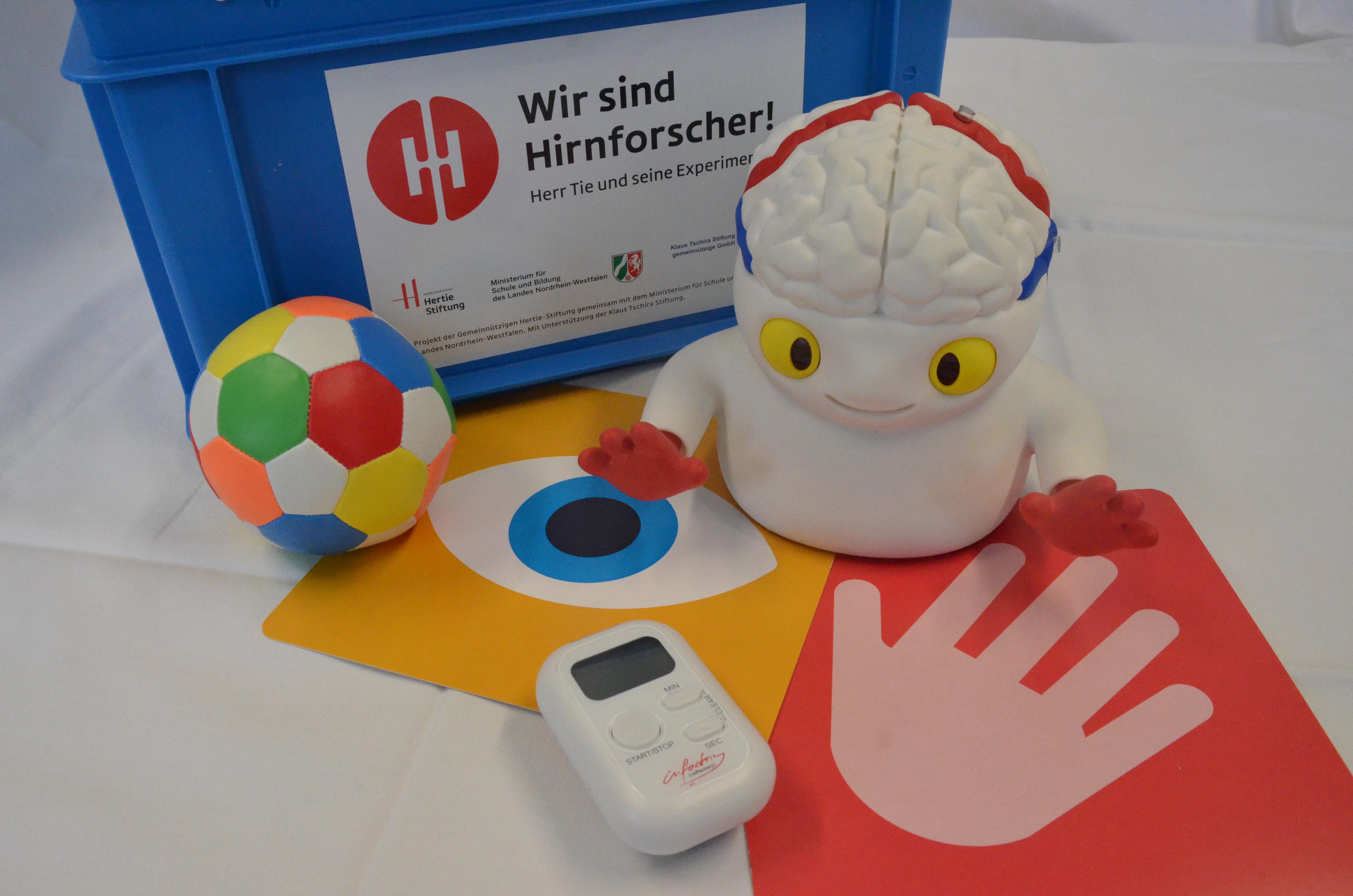 Die Boxen sind mit Materialien zum Experimentieren, Arbeitsblättern und leicht verständlichen Anleitungen ausgestattet. Ebenfalls zu den Boxen gehört „Herr Tie“ – ein Roboter, der sehen, hören, tasten und sich frei im Raum bewegen kann. Die Schüler/innen können ihm „direkt ins Gehirn“ schauen und herausfinden, welcher Teil des Gehirns für was zuständig ist.