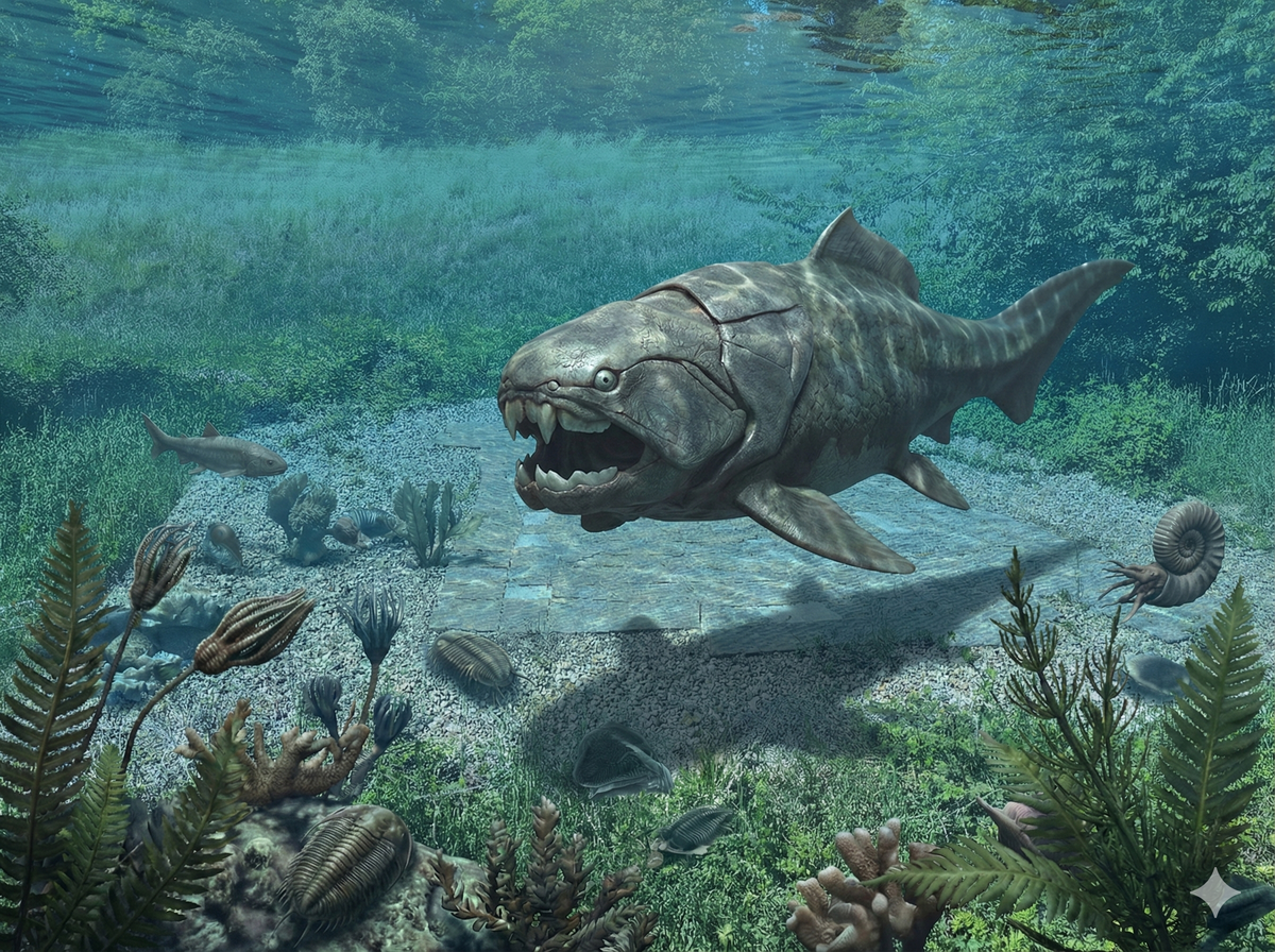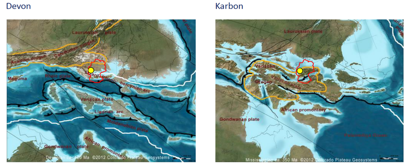 Vor rund 400 Millionen Jahren sah das Ruhrgebiet gänzlich anders aus. Durch das Driften der Kontinente lag auch der Ennepe-Ruhr-Kreis in Äquatornähe, erst an der Küste eines Kontinentes, dann im tiefen Ozean, dann wieder an der Küste eines anderen Kontinentes. In dieser Periode (Experten sprechen von der Devon- bis zur Karbonzeit) explodierte das Leben in den Meeren, prägend sind u.A. Ammoniten und Panzerfische.