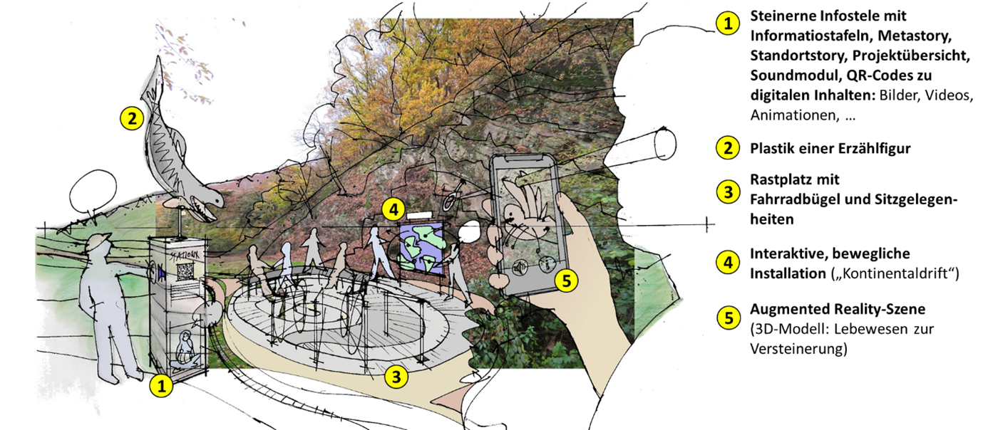 Angedacht ist das Angebot im Rahmen einer erzählerischen Story, plastisch und nachvollziehbar zu gestalten. An jeder Station ist daher geplant, neben einem Rastplatz mit Fahrradabstellmöglichkeiten sowie Rast- und Sitzgelegenheiten, auch eine überlebensgroße Plastik eines Lebewesens aus der jeweiligen Epoche zu platzieren. Eine Infostele soll zudem neben einer Informationstafel über eine Hörstation ergänzende Audiobotschaften und via QR Code digitale Visualisierungs- und Informationsmöglichkeiten anbieten.