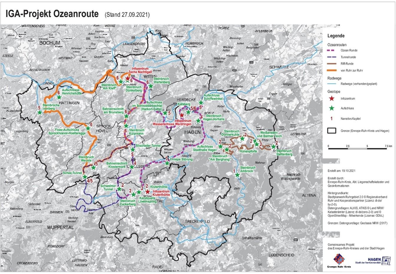 Bereits 2019 haben sich der Ennepe-Ruhr-Kreis, die Stadt Hagen, der Landschaftsverband Westfalen-Lippe (LWL) und der GeoPark Ruhrgebiet e.V. im Rahmen des „Ozean-Projekts“ auf den Weg gemacht, diese Inhalte innerhalb eines gemeinsamen Narrativs zugänglich zu machen und mit Hilfe digitaler Angebote leicht nachvollziehbar und erlebnisstark zu präsentieren. Mit dem Zuschlag des Ruhrgebietes/ Regionalverband Ruhr zur Ausrichtung der Internationalen Gartenausstellung 2027 (IGA 2027) bot sich hierzu eine einmalige Gelegenheit. Das Projekt wurde 2020 zur Teilnahme an der IGA 2027 angemeldet und im darauffolgenden Jahr mit dem Erhalt des ersten von drei möglichen „Sternen“ als „IGA 2027 geeignet“ eingestuft.